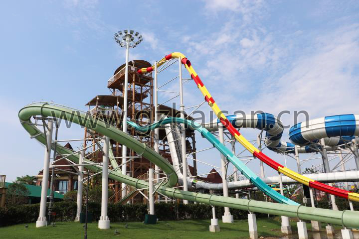 蘇州灣·夢幻水世界景區坐落于蘇州東太湖生態旅游度假區內,總規劃面積為12.1萬平米,海山游樂獨家提供該項目策劃規劃、主題景觀設計,以及部分設備制造安裝服務。在2016年被省旅游局評為2017年省級重點旅游項目,同時被省發改委評為2017年江蘇省重大投資項目,日最大承載量為24323人,瞬間最大承載量為14351人。于2019年6月28日盛大開園。蘇州灣·夢幻水世界是以馬達加斯加熱帶雨林風情為主題,依托太湖天然水系資源,將豐富的熱帶雨林景觀與激情探險相結合,打造出國內首家實景式馬達加斯加熱帶雨林水上樂園。水上樂園設計注重攝取馬達加斯加熱帶雨林地理風貌、人文風情、建筑藝術、生態景觀等鮮明的主題元素,使情景體驗與度假休閑有機結合與有效實現,營造出極具熱帶風情特色的水上休閑世界。